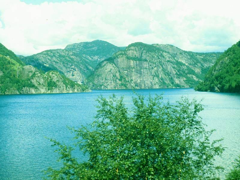 Sorfjörd gave way to Veafjord. The line ran north to Stanghelle then turned away from the coast for Dale. We hit the south side of Bolstadfjord next and ran eastwards, through pretty pastoral country dotted with whitewashed cottages and the occasional stave church - it was pretty much like the Lake District with the vertical scale exaggerated. We hit a brief shower near Evanger then plunged through a deep valley, emerging to run along the north shore of a lake in ever grander mountain scenery. We hit the ski resort of Voss at 4.25 .