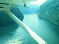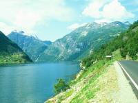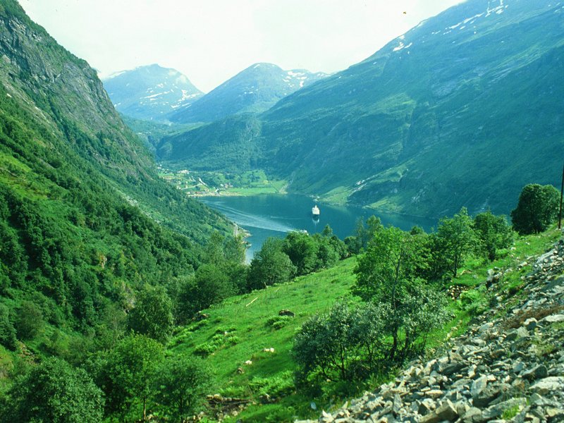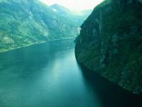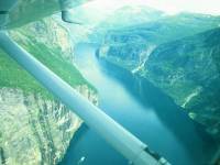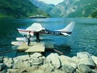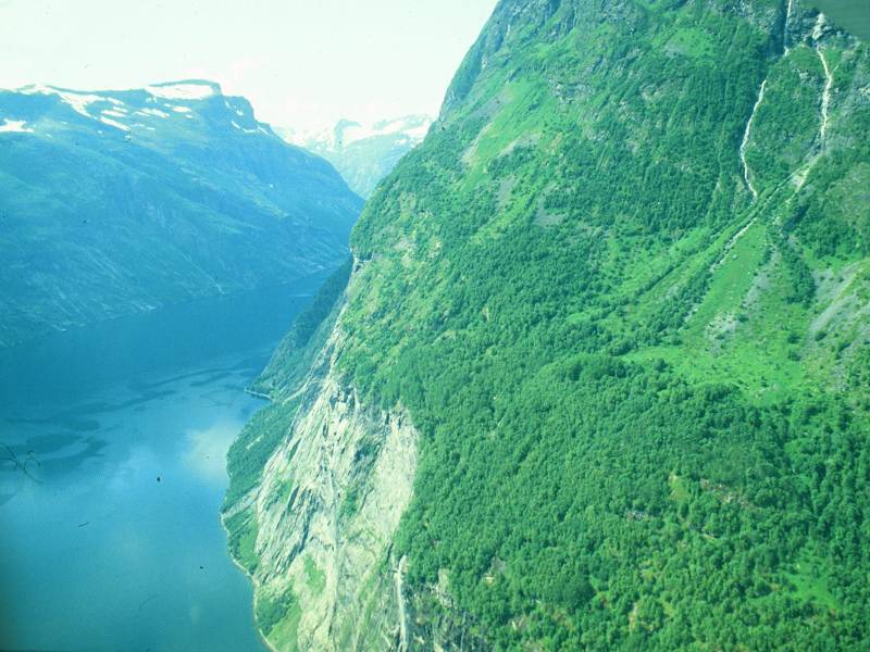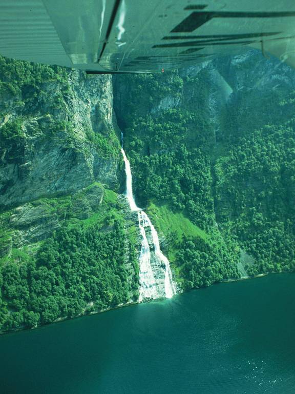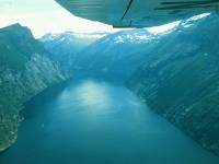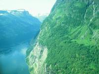 The flight was thrilling! The pilot was a bit of a showoff and delighted in taking us through steep banking turns, and heading straight for the sheer rock walls of Geirangerfjord hen banking away at the last minute. We were flown to the other end of the fjord, than back, up to Flydal, down past Orneveg, and finally back at low altitude for a bumpy landing on the fjord. It cost 90Kr, but it was worth it.
