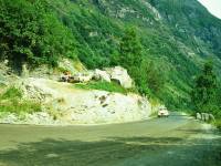 After the flight I decided to walk up the Orneveg (Eagles' Path) road as far as the viewpoint as I guessed that the bus probably wouldn't stop on the way out of Geiranger the next morning. It got very hot, and bikinis were out in force again. Removed layer of clothing. Still too hot. Suddenly thought I heard thunder. There was a lot of cloud to the south and east but here on the zigzags of the road it was sweltering.