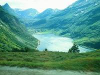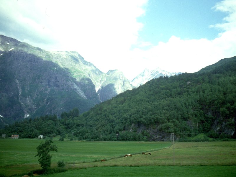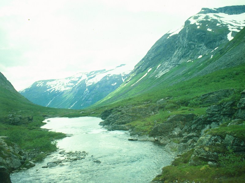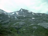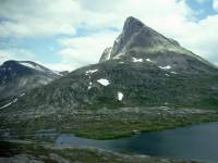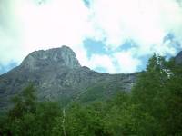 I wasn't able to get any decent shots of the surrounding mountains, which was a great shame as this place seemed to be Norway's equivalent of the Cuillin. Fantastic, jagged pinnacles soared to the north. To the south were three huge rock towers, which i later learned were called the King, the Queen and the Bishop. In the distance was the mind-blowing sight of a ridge of pinnacles just like a meringue topping, except that it was black. Then, as we approached Andalsnes, another peak came into view - the Romsdalhorn, a soaring, Dolomitic tower some six thousand feet high. I though that Norway had exhausted its capacity to blow my mind yet it had just done so once again.