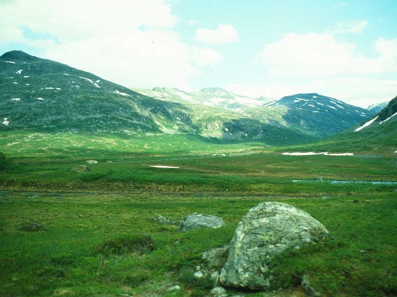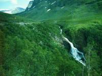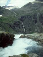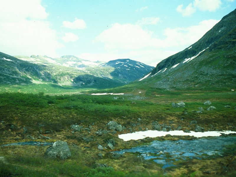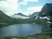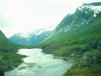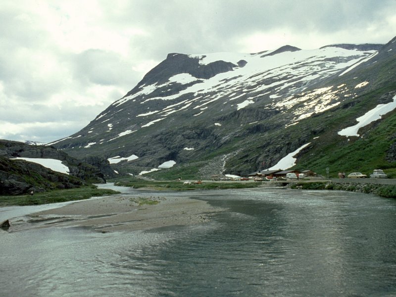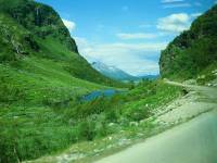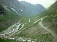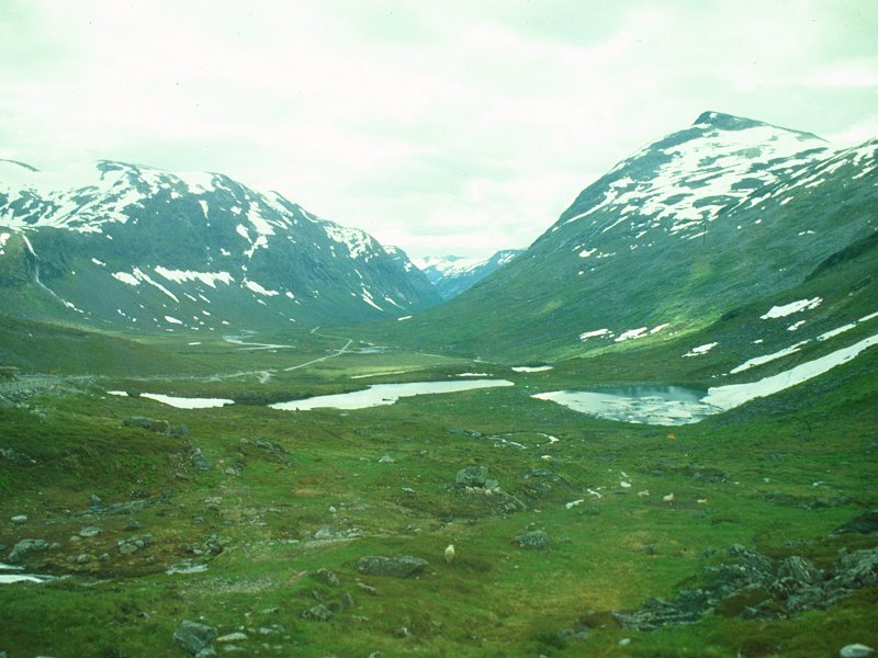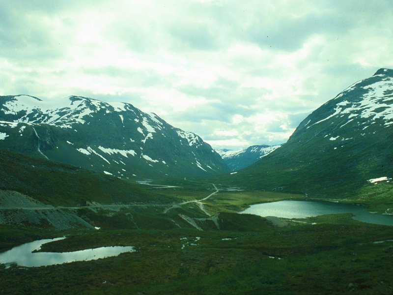The bus climbed Valdal and once again the scenery was spectacular. Although it was cloudy now the cloudbase stayed high and we were treated to scenes of towering mountains and spectacular waterfalls. We entered Meierdal, and now we were in high moorland country. Yet more staggering peaks surrounded us, each topped with snow. The road was built up on sand and gravel embankments around curves and the immediate terrain was positively lunar.