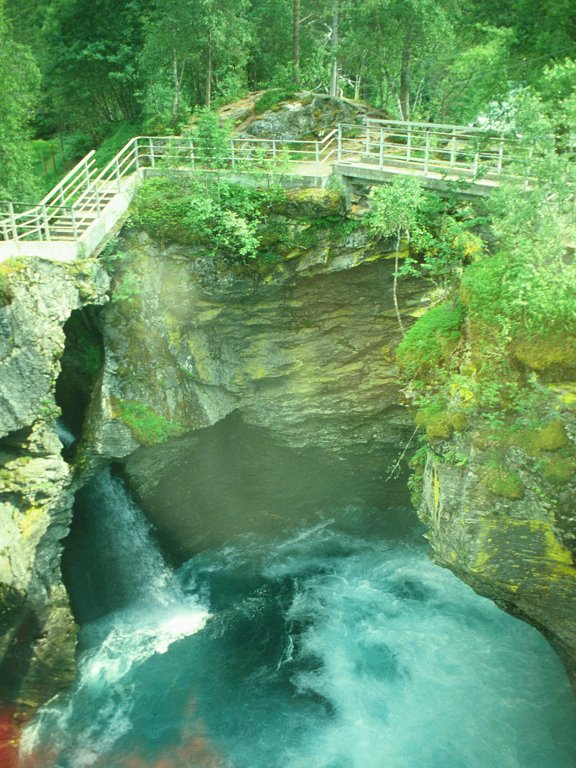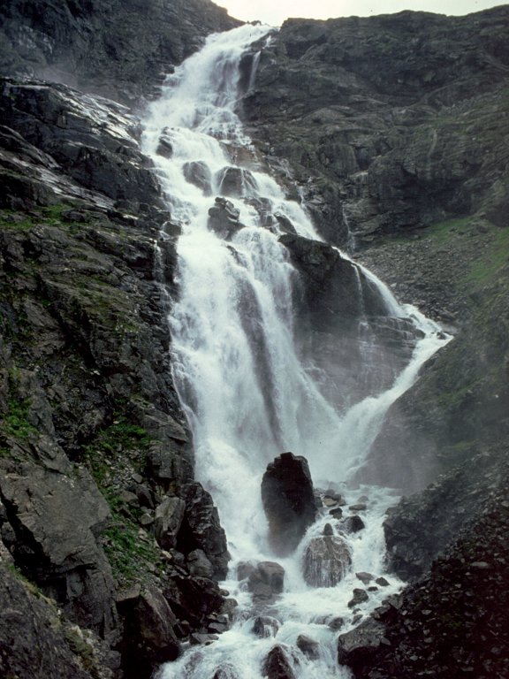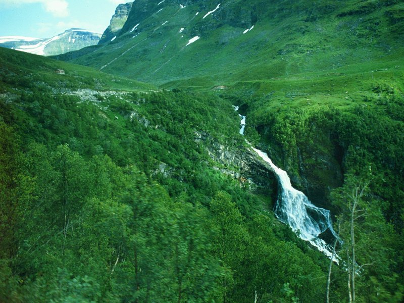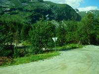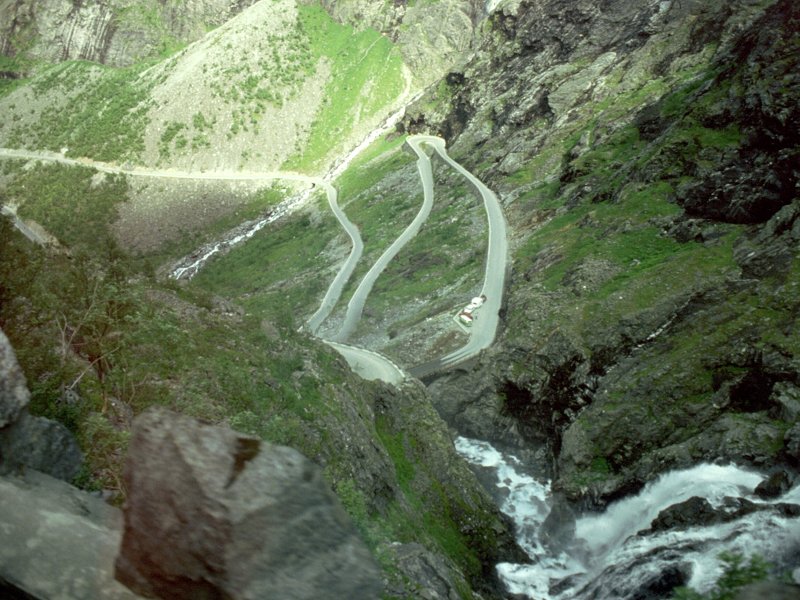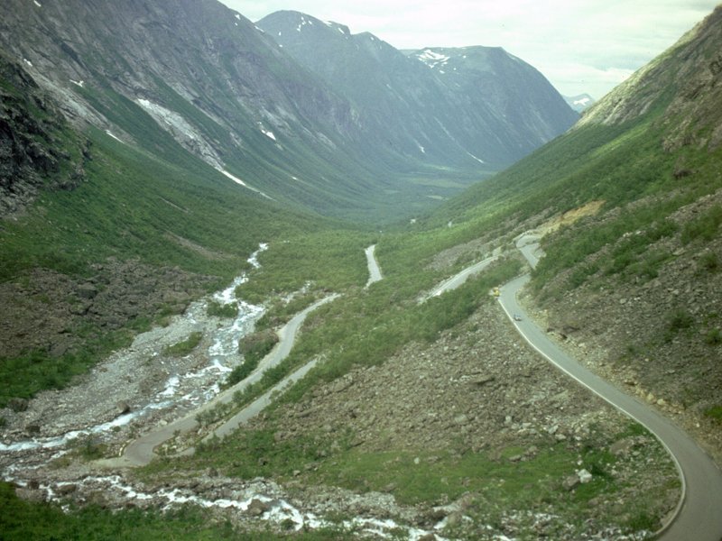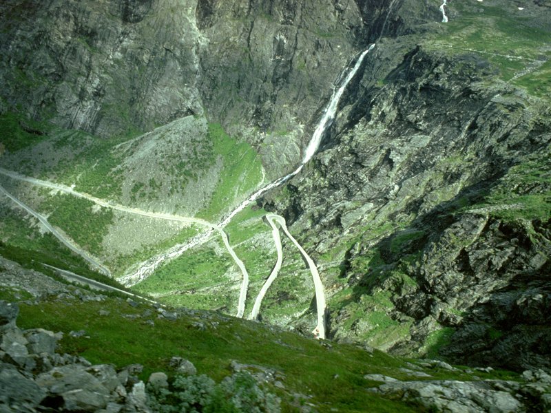 The Troll Road was indescribable. Read back what I said about Flydal and multiply all the superlatives by 3. The road stopped at the bridge at the head of the corrie, and we could see the road descending in crazy hairpins towards Andalsnes, visible three thousand feet below! A great, foaming torrent of a waterfall - Stigfoss - roared down the corrie. The scale was too large to encompass and once more I did the best I could. The road dropped three thousand feet in only a mile, yet there were so many hairpins and doglegs in the road that the driving distance to Andalsnes was 7 km.