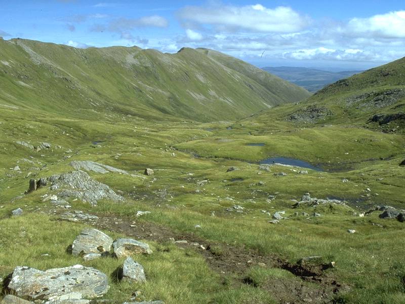 part of the corrie, with a first view of the summit of Mam Sodhail |