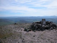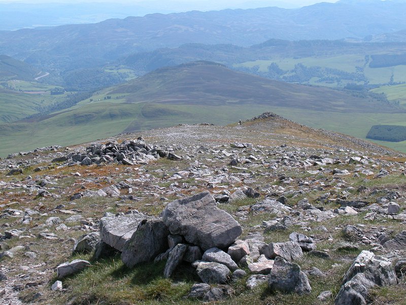 A view to the west across the summit cairn; the Ben Lawers group and Schiehallion are well seen.