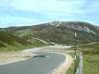 Glenshee road with Carn Aosda behind. The posts are snow markers.