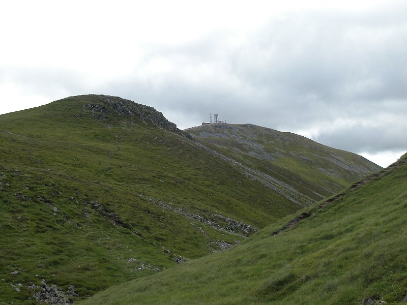away, by the radio huts on its summit. The hill on the skyline is Carn