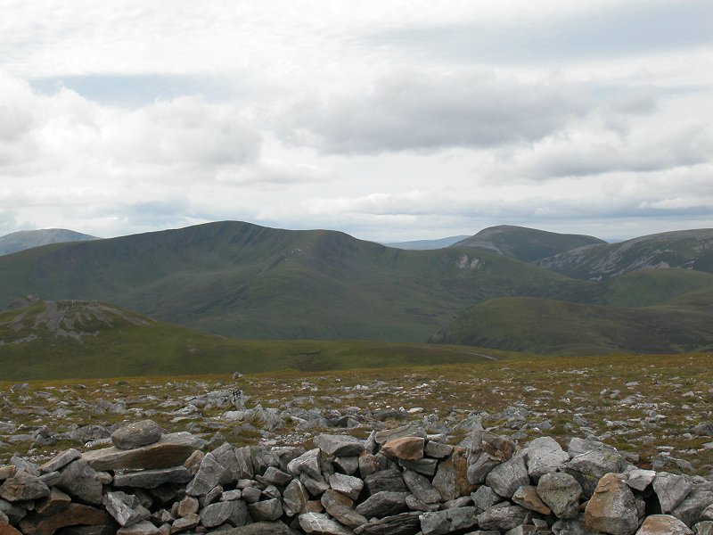 To the northeast is Carn Aosda and its northern hinterland just beyond Loch Vrotachan. I can't identify the far distant hills tjough one of them might well be Geallaig, north of Ballater.