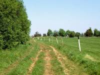 You approached Little Down from the southeast. Turn hard right, through a good 150 degrees, and head east alongside a hedge just up to your right. This is the next stage of your traverse around the edge of Lansdown Hill. The path dips slightly to merge with a track coming up from North Stoke, then rises again to run along the southern boundary of Pipley Wood. The Lansdown Hill golf course is seen to your right.