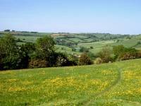 From the monument the Way takes a slightly complicated route and you should keep a close eye on the map and on the waymarks. The path goes half right at the side of the wood then follows the enclosure round in a curve to the right, before going left over a stile where you get a splendid view into the Langridge coombe to the south. (It's not actually named on the map but the valley falls from Langridge (="Long Ridge"?) and it seems as good a name as any. Those with local knowledge are invited to contact me with any info.) Once across the stile you follow the path downhill, veering left then right alongside hedgerows. Watch out for a left fork shortly after the right-hand curve - the turnoff is a lesser path and is easy to miss. If you find yourself heading along a long, straight farm track tending downhill between hedges, then you've missed your turn. Cross a stile to take a path heading diagonally across a series of pastures to the northeast, downhill towards Hill Farm.