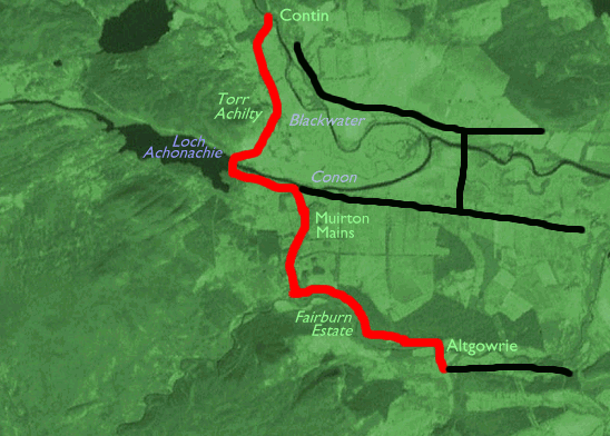 Important note, June 2010:A correspondent who recently walked the route tells me that a major obstacle has cropped up that will involve a complete rerouting of this section between Altgowrie and Contin. He writes:"The route across the dam at the base of Loch Achonachie between Muirton Mains and Torachility (NH446545) is to be closed permanently from 1 June 2010 'for health and safety reasons'. The fence has already been constructed with large gates. No other obvious alternative exists other than the road at Moy bridge." The closing of the Loch Achonachie dam to walkers is a real blow and for the present walkers will need to use the road bridge at Moy Bridge (direct along the road from Altgowrie) and thence alongside the main road to Contin. This is very unsatisfactory indeed and I will need to research whether any alternatives exist. |