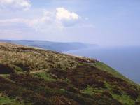 In this case, it must be admitted that the term "coast path" is something of a misnomer. It is certainly the nearest right of way to the coast, but it does wander up to a mile inland at a couple of points. The lack of coast and cliff scenery is, however, grandly compensated by the moorland environment. Today's route climbs and crosses Selworthy Beacon, a semidetached outlier of Exmoor and in my opinion its most scenic corner. The walking is easy, the views are wide, the air is clear. To the west, the North Devon coast path looks very inviting. To the south is Dunkery Beacon, and the latter half of yesterday's hike. To the east are the Quantocks and the coastal plains of the Bristol channel. And to the north, across the channel, is Wales.