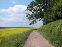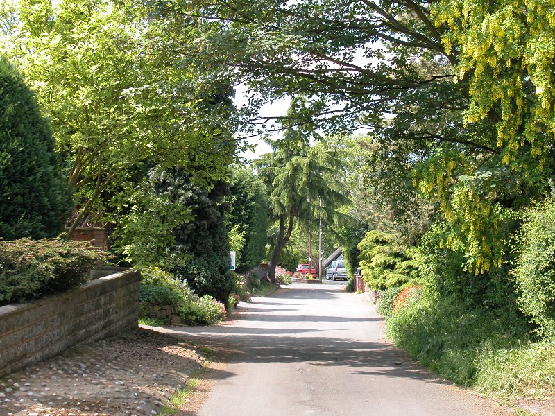 The Way now runs along the drivewy to the castle. The drive is planted either side with laburnum trees, which look glorious in May when in blossom. They smell lovely too, but don't touch them - laburnums are poisonous. The drive climbs the western aspect of the hill quite steeply before doglegging to the left and then swinging clockwise round three sides of a plantation of trees, hugging the 210 ft. contour. The trees hide the castle from view.