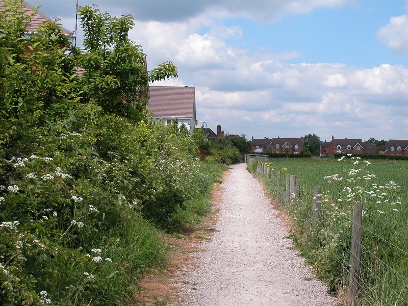The path leaves Bidford remarkably quickly. Initially it hops through two lanes and a suburban back road, after which it runs along a path hugging the back gardens of a long row of older properties facing the main road to the west. The older properties give way to a new estate, after which the path converges with the road. Ahead is a humpback bridge carrying the road across the abandoned branch line from Stratford to the equally defunct Redditch to Cheltenham line.