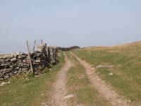 The unenclosed section lasts perhaps half a mile. The lane is heading for the Ribble/Wharfe watershed not much over a mile ahead, but before this point is reached the route of the Pennine Way veers off to the left. The point at which it does so is obvious, just after the lane crosses a transverse stone wall on a diagonal. Take the prominent path up the slope to the left.