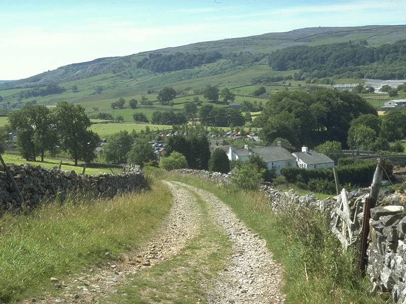 If this walk has an official start it's the well known Pen-y-Ghent Cafe, one of the Pennine Way's premier staging posts and a refreshment, information and gossip centre for hikers, cavers, cyclists and all manner of outdoor types. Head north along the main road and, at the corner just before the bridge over the Ribble, turn right and walk in front of the Crown Hotel, then immediately left. If you're coming down from the railway station you'll approach this corner from the west and go straight on past the Crown and then left. You're in Harber Scar lane.