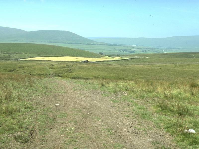 Cam High Road runs almost dead straight for the next three miles, at first along the summit of the ridge, later along its eastern slopes. There is little to see. There are views down into the valley of Cam Beck for a while, and a mile north of Cam End the Dales Way diverges from the Pennine Way and heads down to the left on a falling gradient. It's heading for the lonely farm of Cam Houses, which sits almost on the main watershed; beyond it the land begins to fall again to the valley of Oughtershaw Beck, a far offshoot of Wharfedale. Another mile ahead the Pennine Way clocks up its hundredth mile, an event one feels ought to be physically marked; alas, there is still nothing to see.