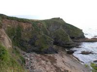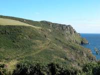 Follow the coast path around and above the first section of beach (un-named on the map but presumably Creek Stephen beach). Soon afterwards you pass a National Trust sign and the familiar regime of pastures and scrubby slopes resumes.