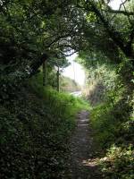 As the path approaches Porthbean it gets hemmed in by hedges and trees, before descending quite steeply to the beach itself. Make your way along the sands to find a path rising diagonally up the slope, and follow it.