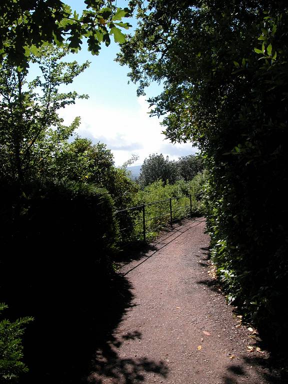 There is one major path junction, at a clearing; about 600m south of Higher Hopcott the correct path goes half right, tending south-southeast. Thence continue through the wood, still climbing, for a further 700m to gain the main ridge path, a wide forest ride crossing your track east-west. There is a clearing and a picnic table here.