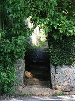 Our first task is to find the commencement of the route from the town centre. We shall be following the West mendip Way, which for this first section is coincident with the Monarch's Way. It's not entirely straightforward. The WMW is obvious on the map but not so easy to access unless you follow the directions closely. Yesterday you reached the market square by coming through the arch from the Bishop's Palace. Today you need to go through the other arch; the one on the left as you look from the square, which gives access to the cathedral close. If you've not already done so, now is the time for a good poke around the catherdral precincts. Don't miss Vicar's Close, which was depicted on yesterday's walk page. Now, you need to exit the cathedral green from the gate at its northwest corner and walk for some 250m along the A39 Bath road, before turning left into Lovers Walk, a narrow walled lane that is signposted as a public footpath.