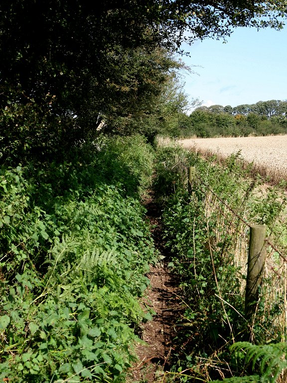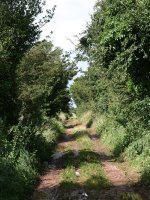 The last section of this path runs into a little hollow fringed by a ribbon of trees. If it's been raining recently then it could well be sloppy here. Once you come out into the open again the path turns half left and begins to run downhill towards Bradley Cross.