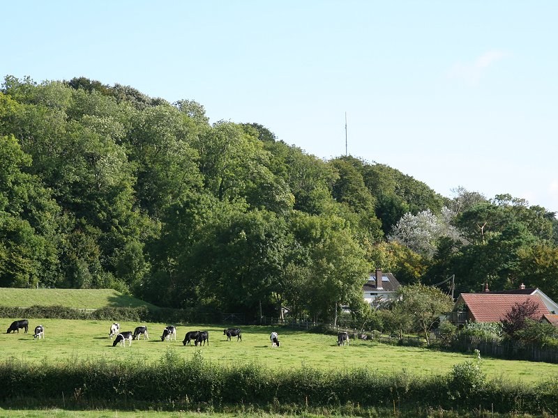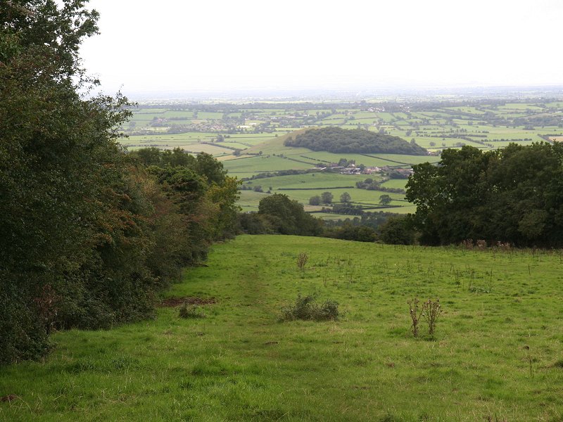 The path enters tree cover for a distance; it seems far longer than the map suggests. Eventually you come out into a clearing between the trees (the Americans would call this a "bald"). You're on Arthur's Point, elevation unknown. The views are a bit restricted due to the nearby trees, but much of Wells should be in view and you will not fail to spot Tor Hill at Glastonbury, five miles to the south. The Somerset Levels are in fact dotted with strange, isolated conical hills - the nearby Hay Hill, southwest of Wells, is a fine example.