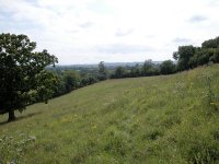 The road, having wound its way to the top end of the gorge, now follows what is effectively an offshoot to the southeast. Cross the road and walk through another short stretch of woodland to come out into Velvet Bottom. Effectively the continuation of Cheddar Gorge by another name, Velvet Bottom is appropriately named. It's floored by a pasture of lush green grass that could almost be used as a tennis court. The walls of this dale are downy slopes rather than naked limestone but the scenery, while lacking the drama of the lower gorge, is still more than pleasing. The dale winds sinuously along for the best part of a mile, the path climbing at least one bank that has every appearance of being a disused earth dam.