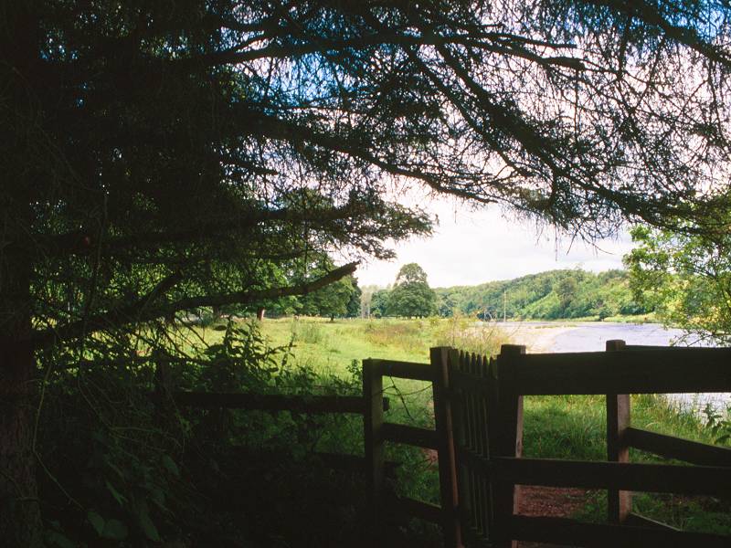 Then, suddenly, the trees thin to your right and you're standing on the banks of the Tweed. This fine river rises at Tweeds Well in the lonely hill country north of Moffat, and flows northeast to Peebles and then generally eastwards through Galashiels, Melrose, Roxburgh and Coldstream before entering the sea at Berwick. For most of its length eastwards of Coldstream it defines the England - Scotland border.